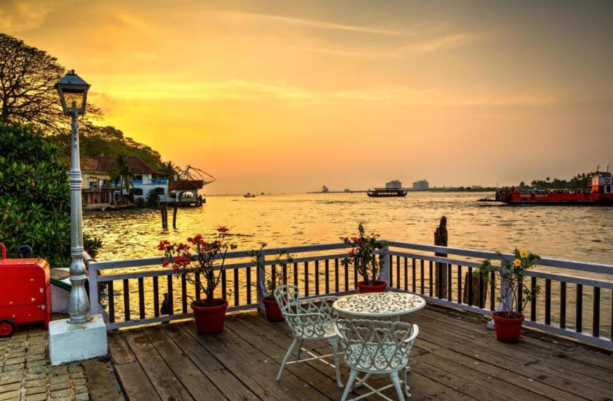 Brunton Boatyard in Fort Kochi is a captivating heritage hotel set in a restored Victorian shipyard, offering stunning views of the Arabian Sea and the iconic Chinese fishing nets. The hotel’s architecture, a blend of British, Dutch, and Portuguese influences, features high ceilings, arched windows, and antique furnishings that exude old-world charm. Each room provides modern comforts while transporting guests back in time. The acclaimed restaurant serves a fusion of traditional Keralan and colonial-era dishes, making for a delightful culinary journey. The waterfront terrace is perfect for enjoying sunset drinks while watching the harbor’s activity. With impeccable service, historical ambiance, and a prime location, Brunton Boatyard provides an immersive experience that embodies the rich maritime heritage of Fort Kochi.